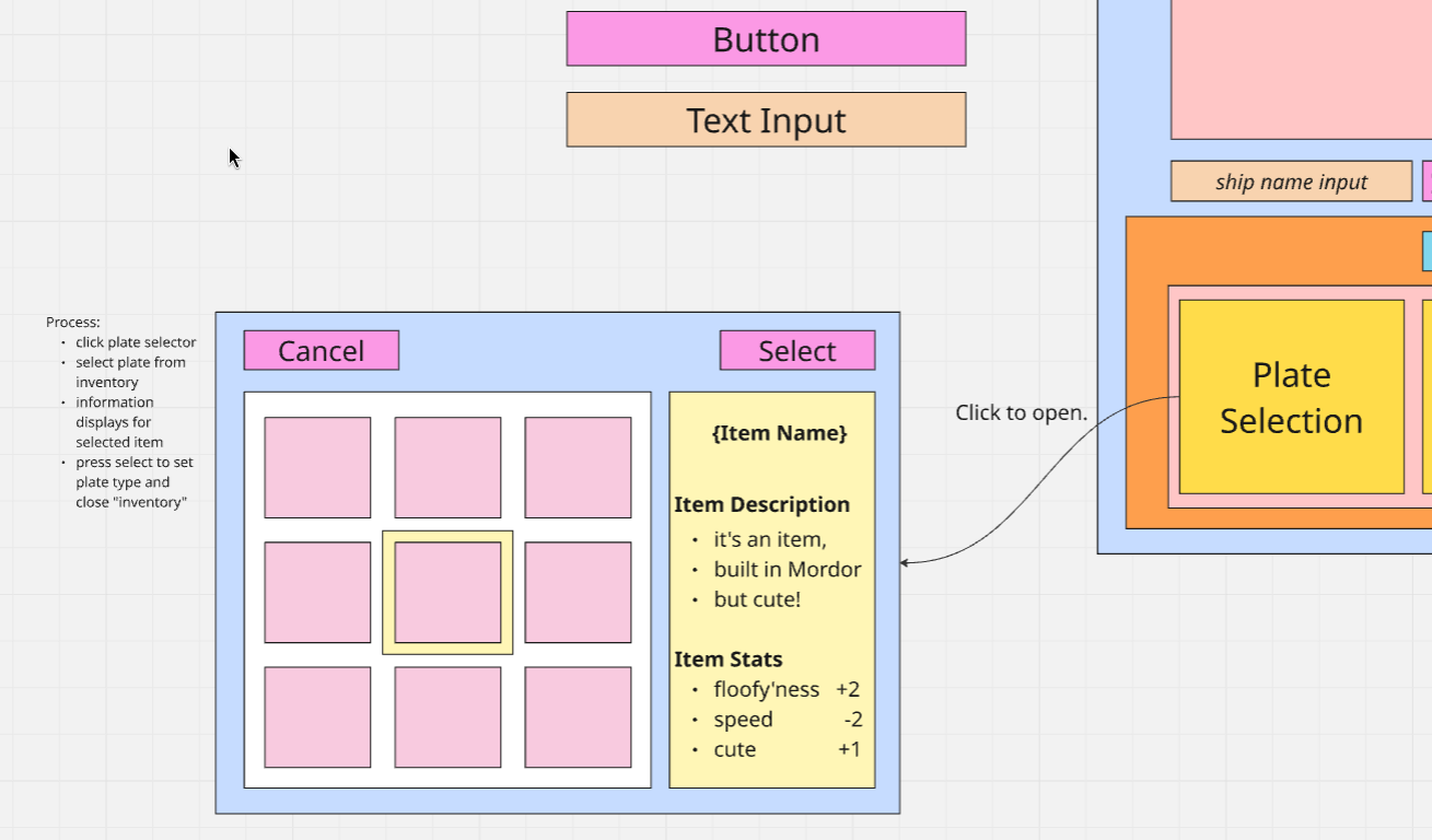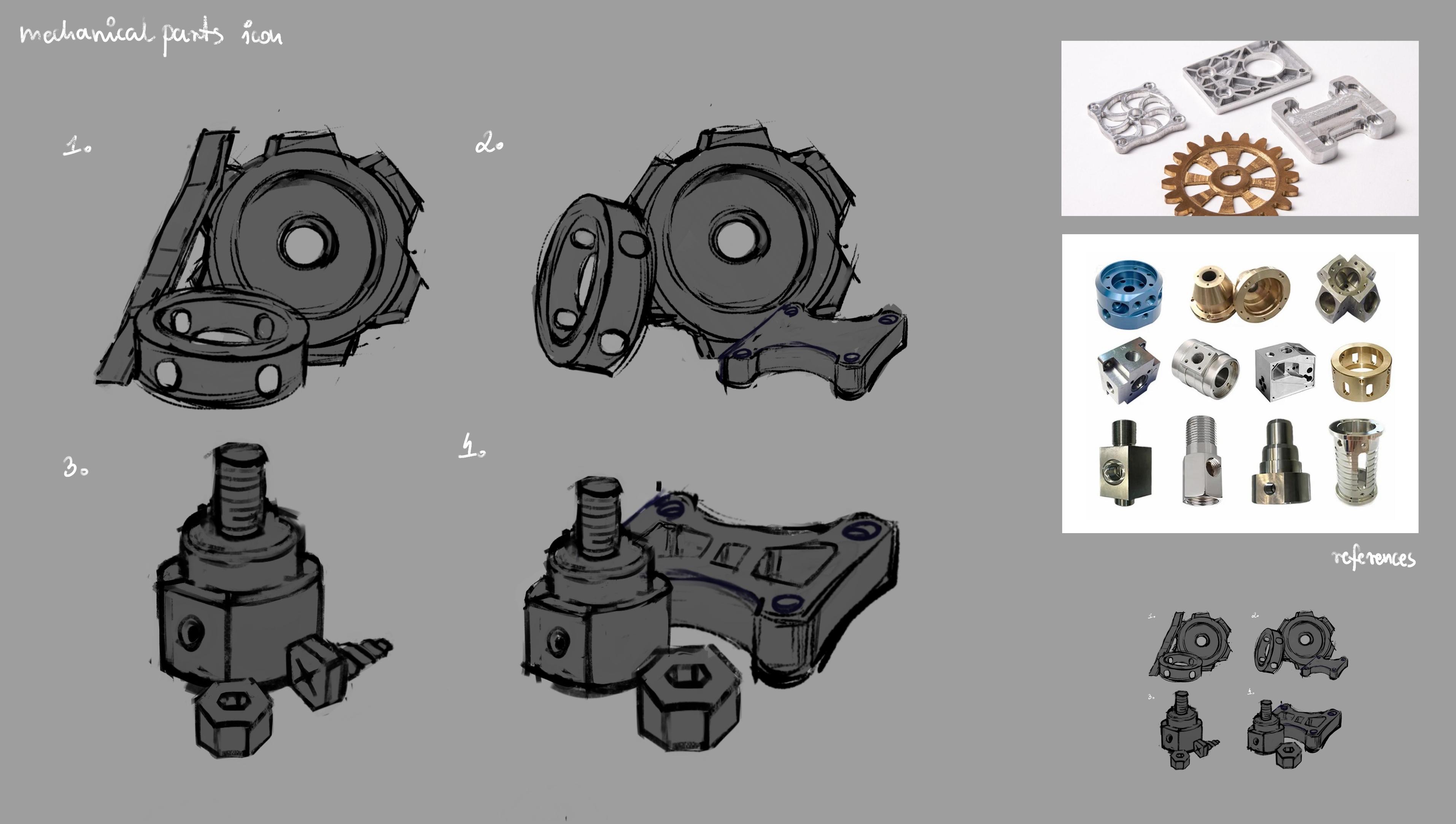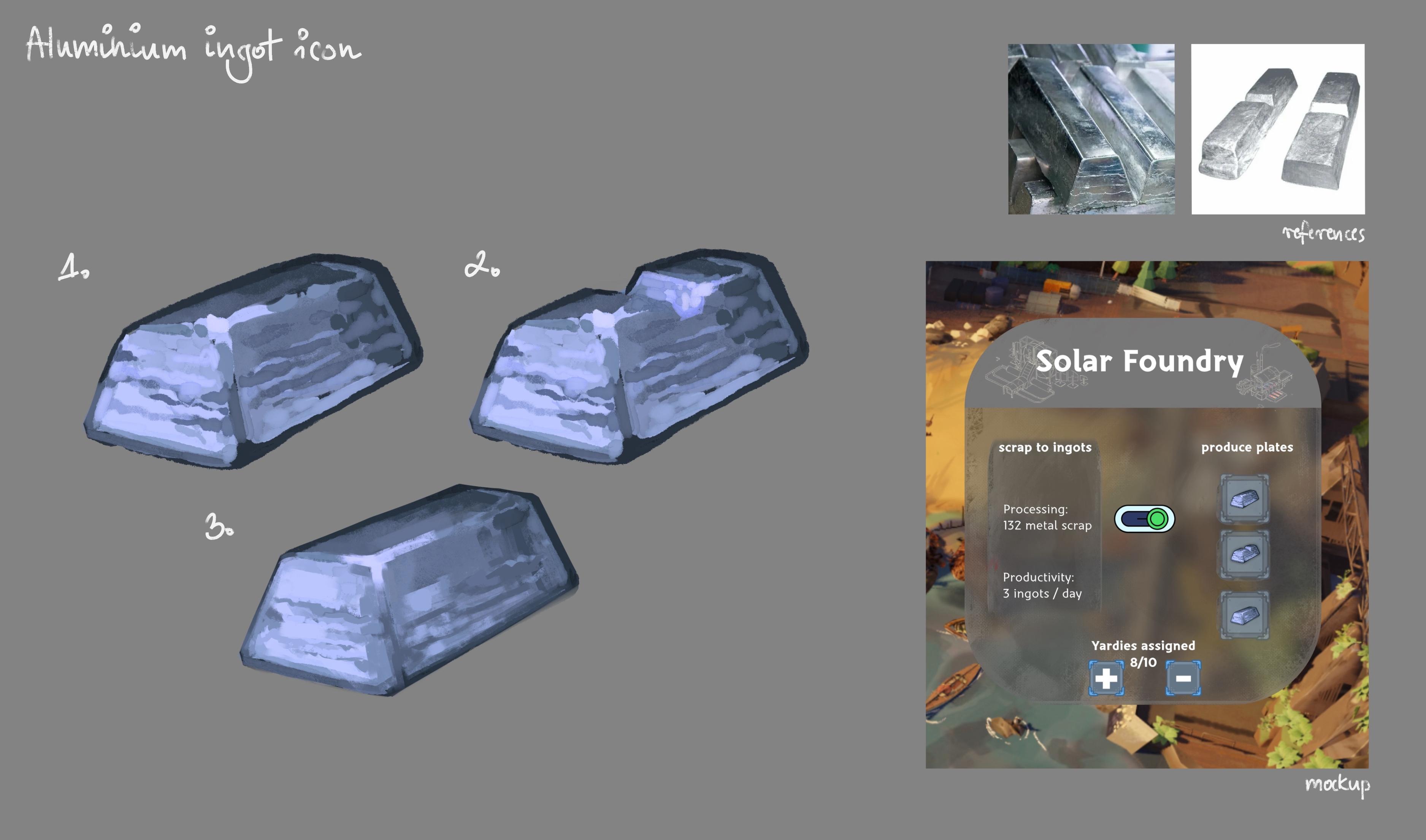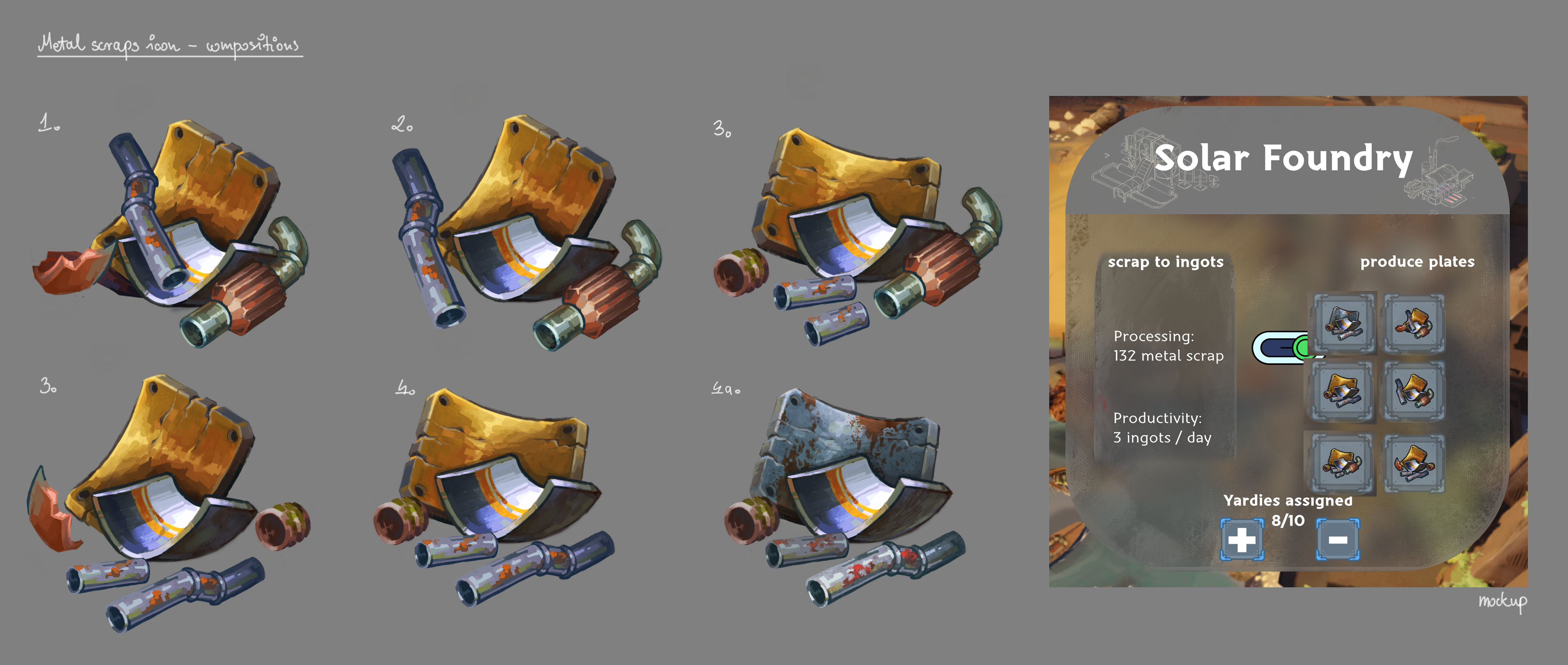 We explored various options for the way players will transform scrap metal and mechanical parts into ingots in the Solar Foundry, and then cast ship parts to assemble in the Hangar, engines in the Makerspace.
